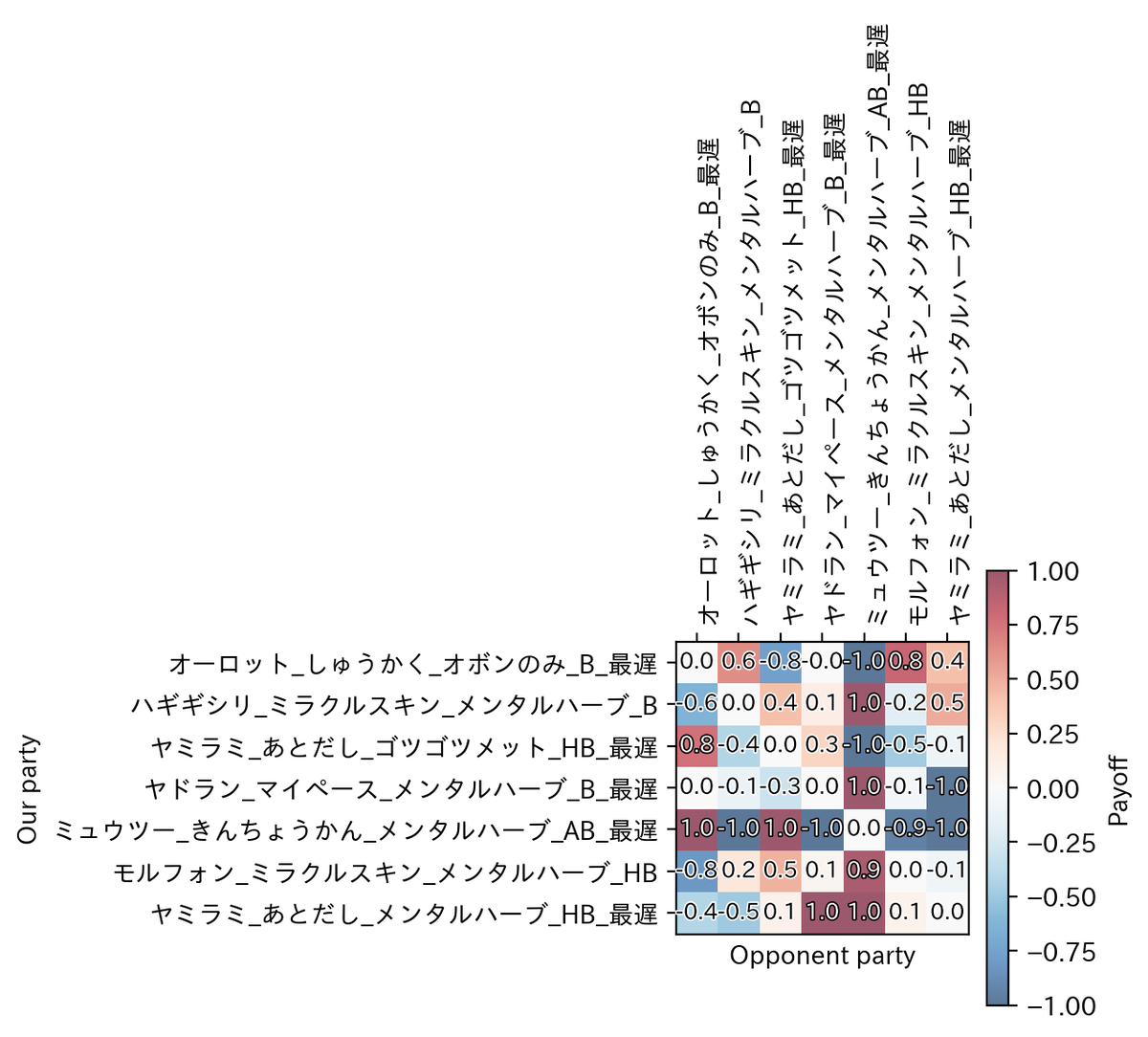 主催のごりちゅうさん、対戦してくださった方ありがとうございました。乱数での特防ダウンが効くので、(A連打するだけではあるのですが)最後まで気の抜けない戦いになるのが面白かったです。 技術面では、今までで参加した中で最もシンプルな殴り合いのルールとなり、LLMを用いたヒューリスティックよりも数値レベルの最適化問題としてとらえたほうが良かったように思われます。現状の枠組みにとらわれず、様々なアイデアの検証を進めていこうと考えています。