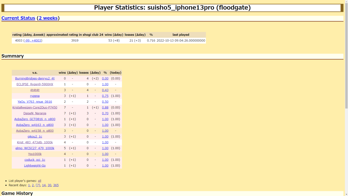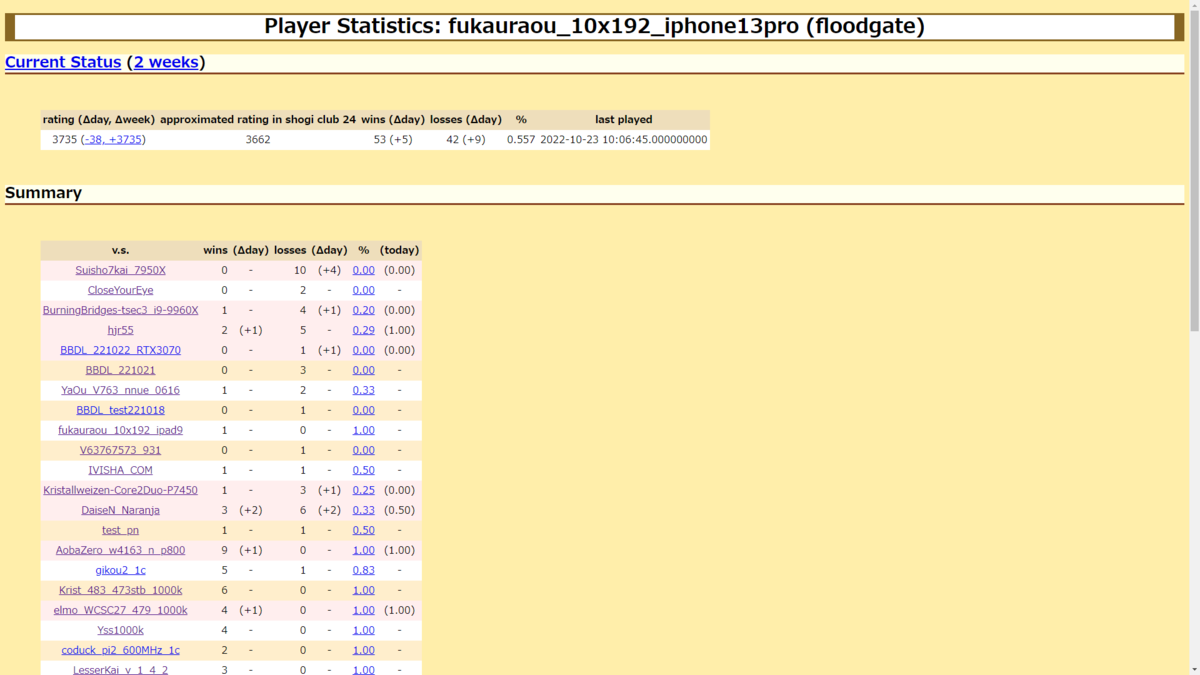 iPad9で3647、iPhone13Proで3735となりました。通信不良が原因と思われる時間切れ等、棋力とは関係ない勝敗も含まれているのであまり測定精度は高くありません。