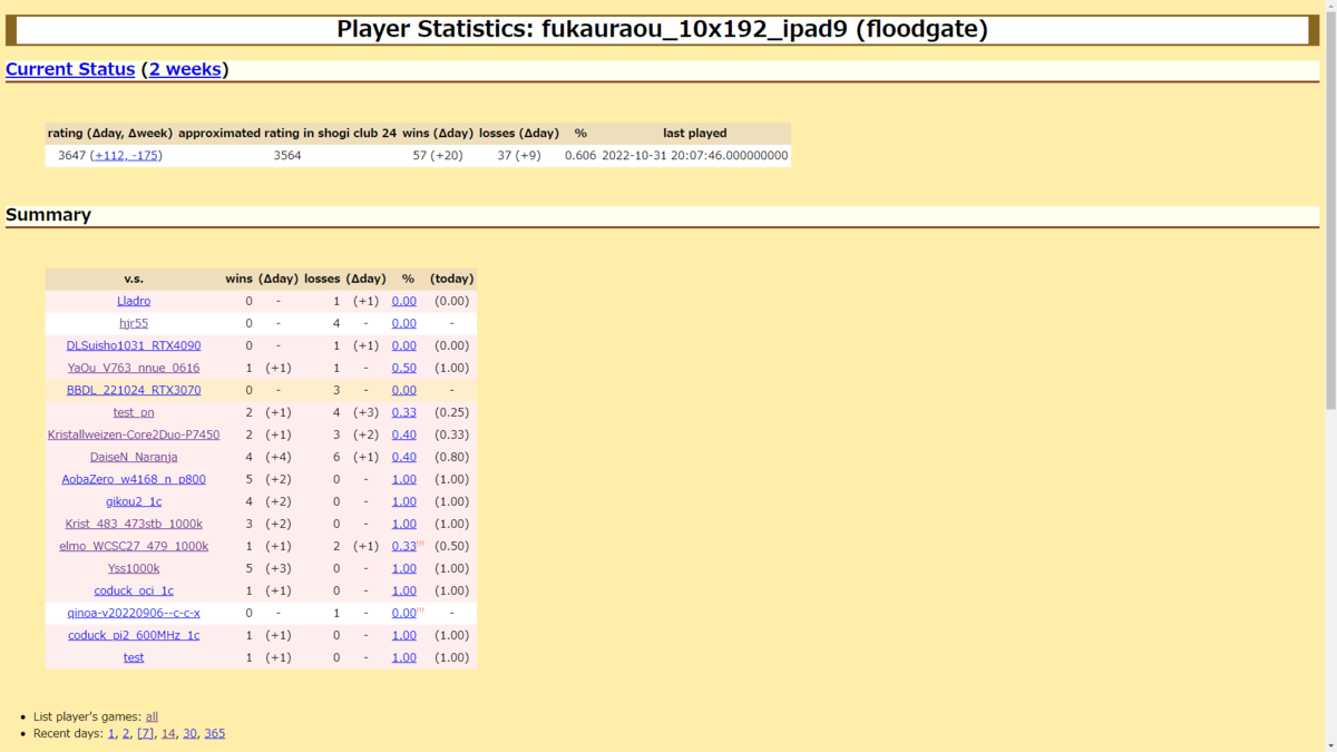 レート4361(対戦時点の値。2022-10-23時点では4186)のBurningBridges-tsec3_i9-9960Xに勝ったり、レート3300のgikou2_1cに負けたりと、かなり不安定な印象がありました。