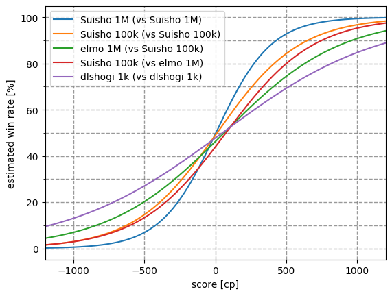 本記事では、実際に複数のソフトの棋譜を用いて評価値を勝率に変換する関数を求めます。結果として、ソフトにより係数が異なるだけではなく、同じソフトであっても対局相手により係数が変化することがわかりました。